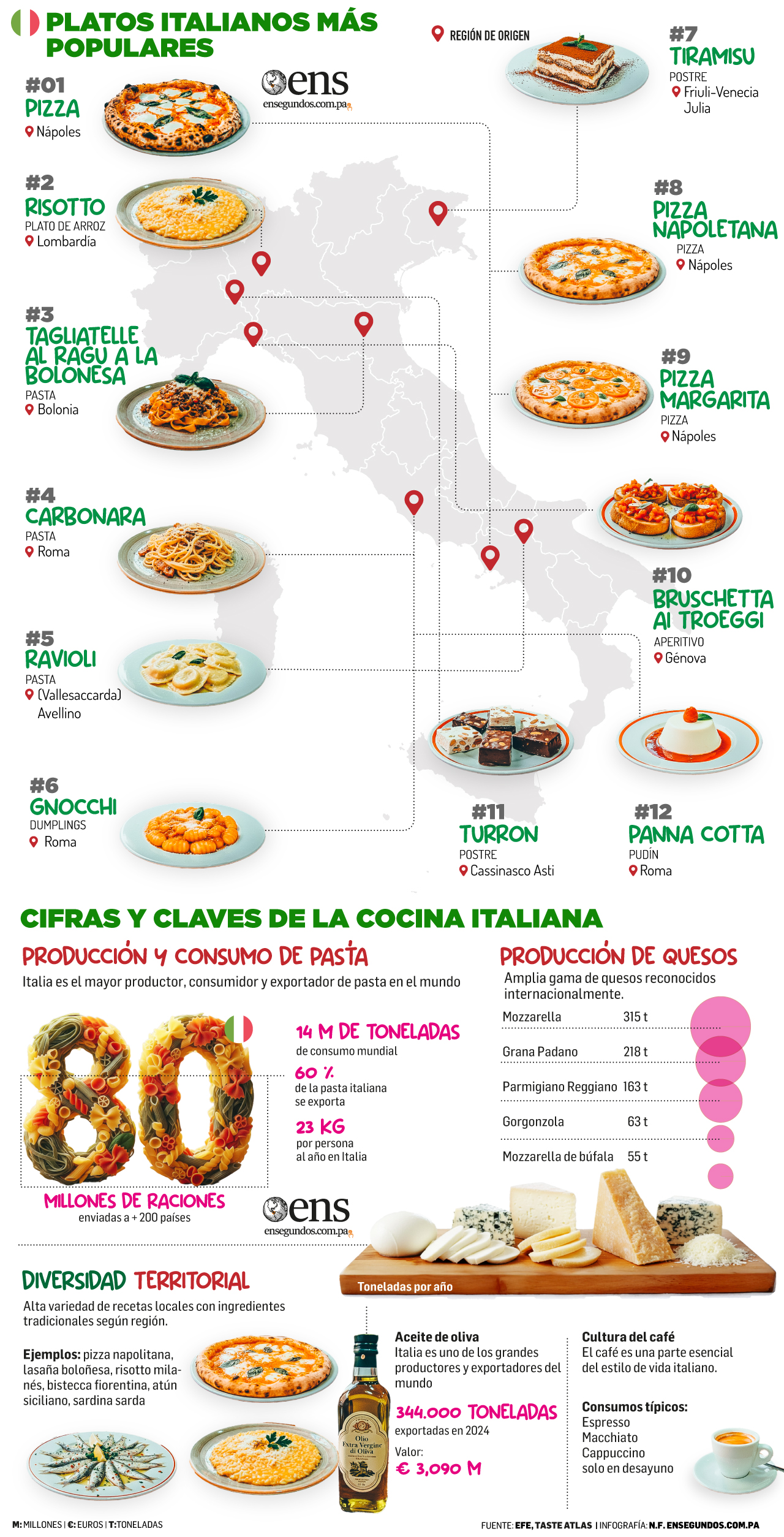 Cintillo, Estilos, Infografía La cocina italiana, nuevo Patrimonio de la Humanidad de la UNESCO Infografía N. Fernández, Ensegundos.com.pa | EFE 14 diciembre, 2025 Comida Estilo de Vida Gastronomía Infografia Italia UNESCO Ilustración: N. Fernández, Ensegundos.com.pa WhatsAppFacebookTwitterGoogle+LinkedInPinterest El Comité del Patrimonio Inmaterial de la Unesco inscribió a la cocina italiana en su Lista Representativa, que incluye platos emblemáticos como la pasta, la pizza, el risotto, el tiramisú, la panna cotta, entre otros