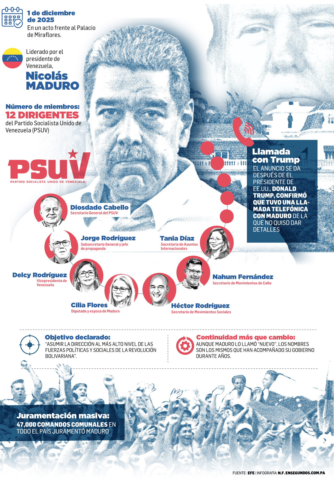 El presidente de Venezuela, Nicolás Maduro, designó un nuevo buró político, integrado por doce dirigentes del chavismo, “para que asuman la dirección al más alto nivel de las fuerzas políticas, sociales y de la revolución bolivariana”, en medio de las crecientes tensiones por el despliegue militar de Estados Unidos en el Caribe