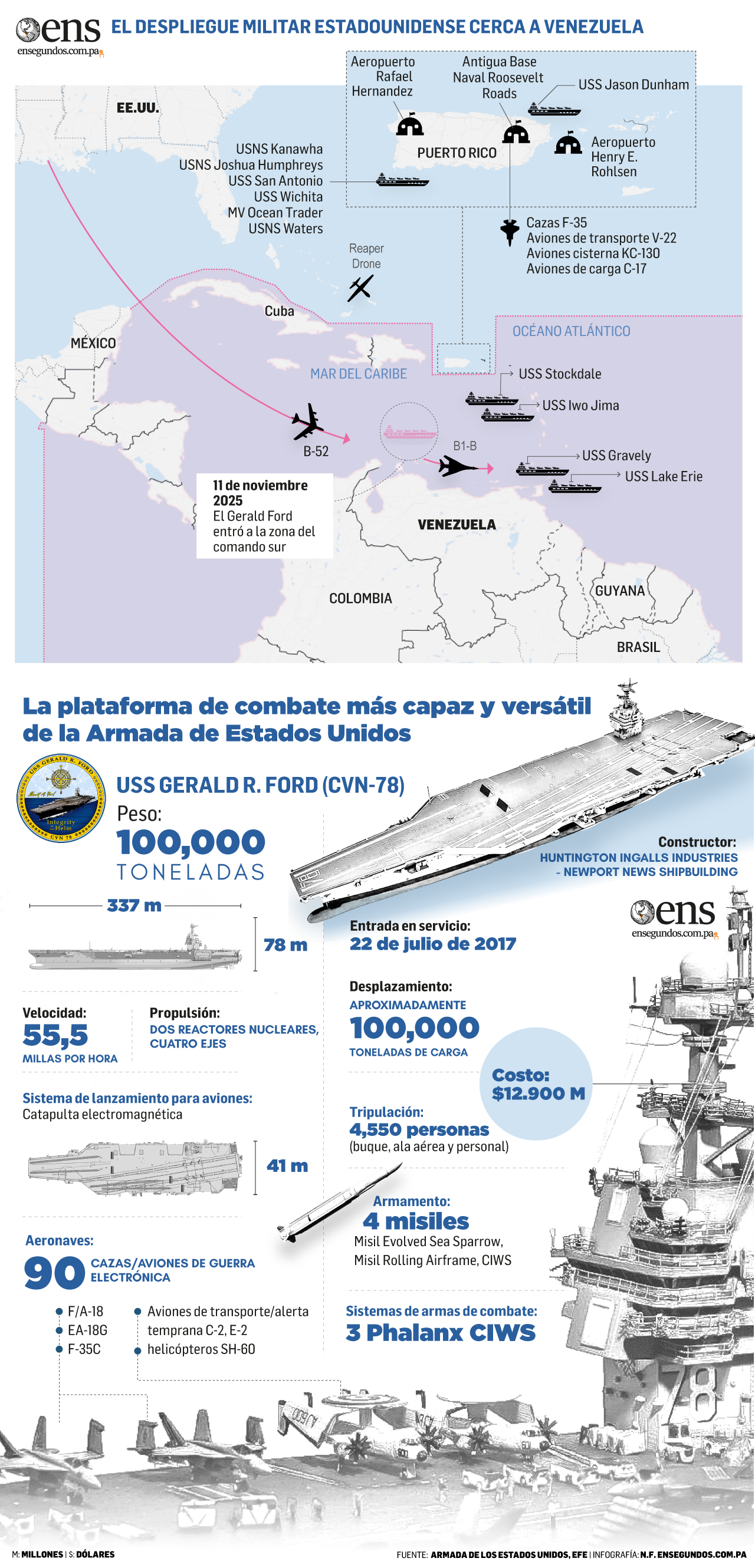 El portaaviones más grande del mundo, el USS Gerald R. Ford, opera en aguas del Caribe como parte del despliegue estadounidense para desmantelar presuntas organizaciones criminales. Con capacidad para 4,500 tripulantes y 70 aeronaves, es considerado la plataforma de combate más capaz y versátil de la Armada estadounidense