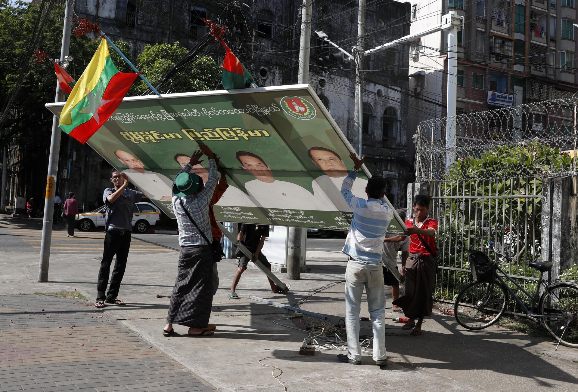 Hombres mueven valla con rostros de candidatos a las elecciones de Birmania. (Elecciones, Golpe de Estado, Birmania) EFE/EPA/NYEIN CHAN NAING