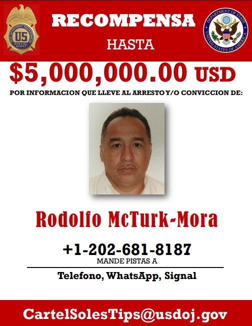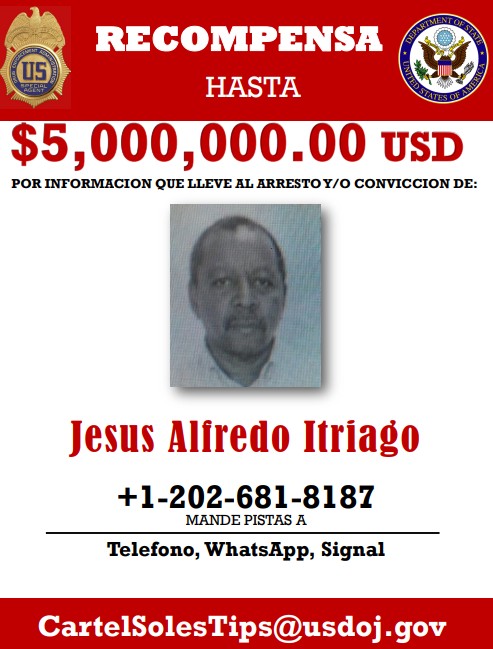 Estados Unidos señala que es la primera persona de la lista que excede una recompensa de $25 millones. Para entregar cualquier tipo de dato, hay que enviarlo a la dirección de correo electrónico CartelSolesTips@usdoj.gov.