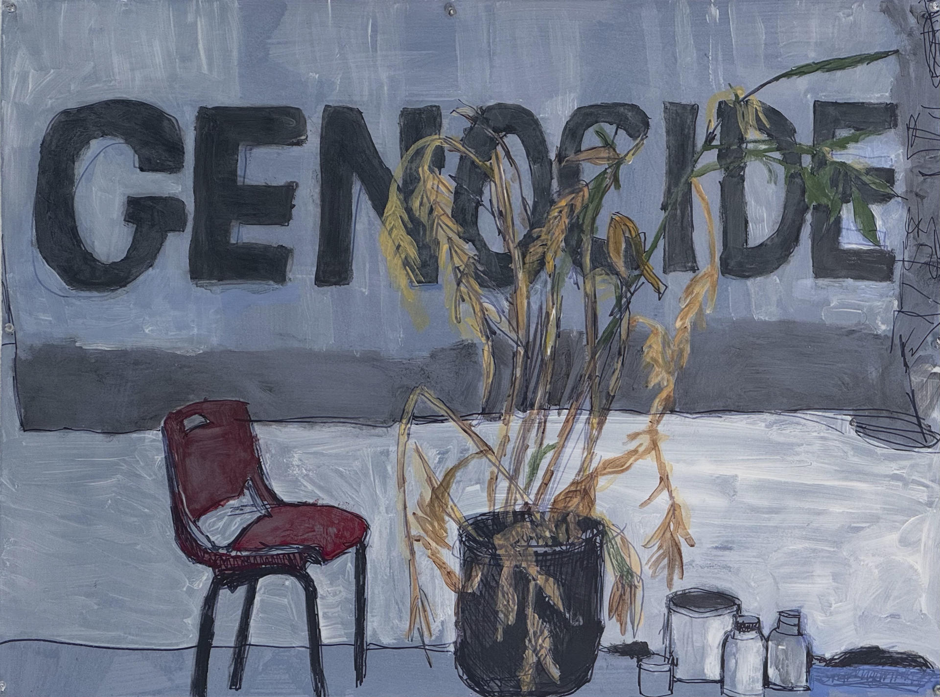 En una de ellas, la palabra “Genocidio” aparece pintada en acrílico sobre una pared gris, parcialmente cubierta por una planta marchita, una imagen que resume el tono incómodo y provocador de la muestra.