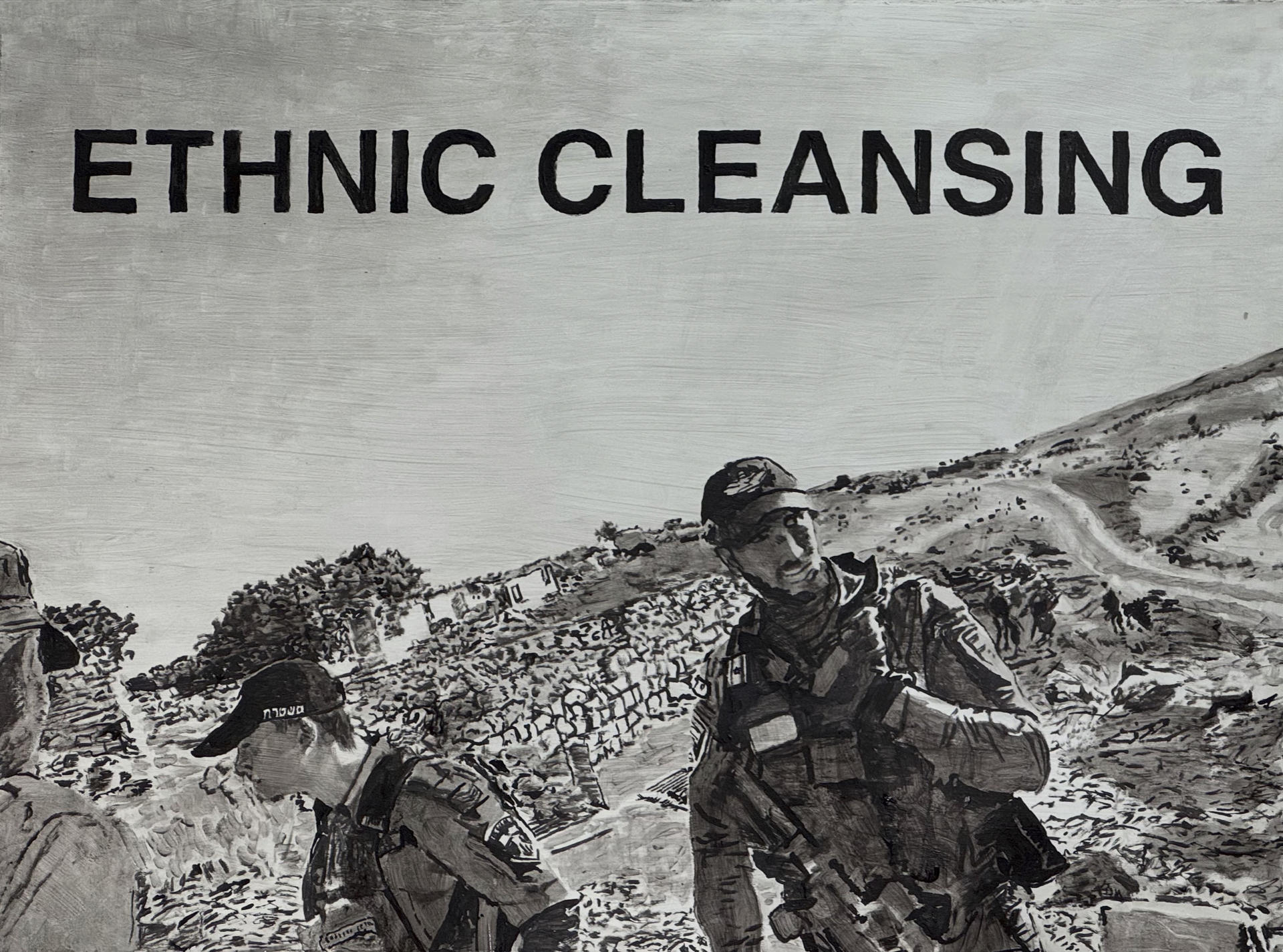 Las nuevas piezas sobre Gaza, como Bicycle Riders (2024), se basan en imágenes del fotógrafo gazatí Jaber Badwan y muestran paisajes grises dominados por montañas de escombros, donde las figuras humanas aparecen diminutas.
