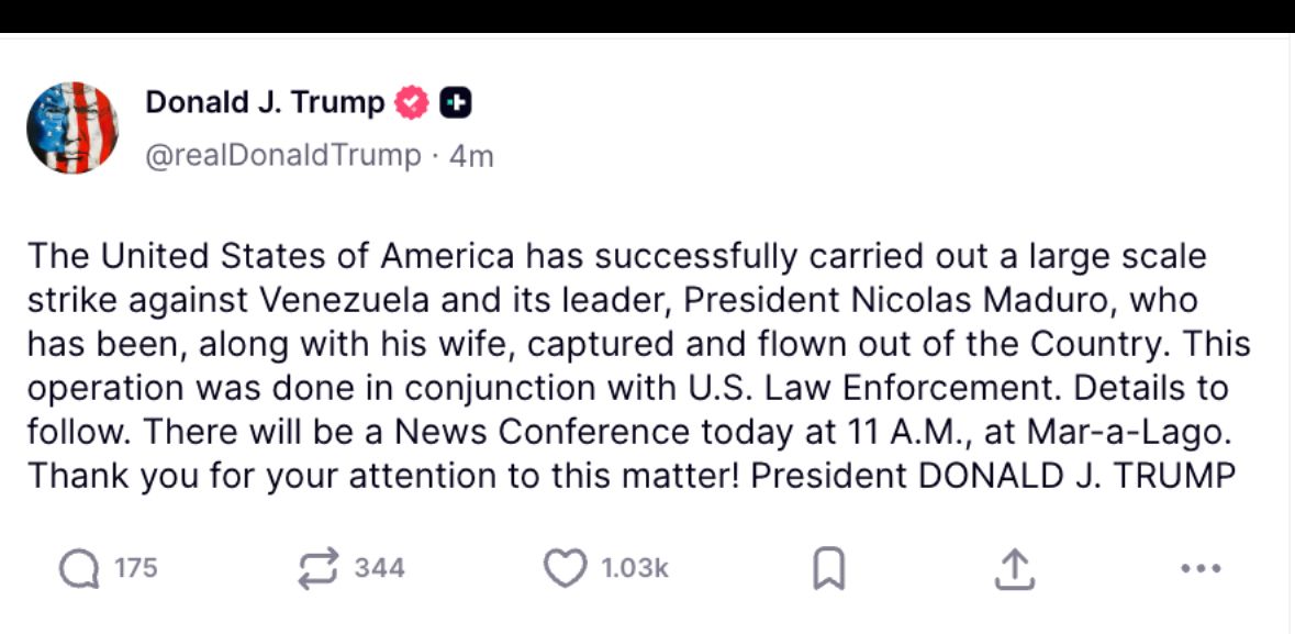 De acuerdo al informe, Trump confirmó que Estados Unidos ha llevado a cabo “con éxito un ataque a gran escala contra Venezuela y Maduro, que ha sido, junto con su mujer capturado y sacado por aire del país”.