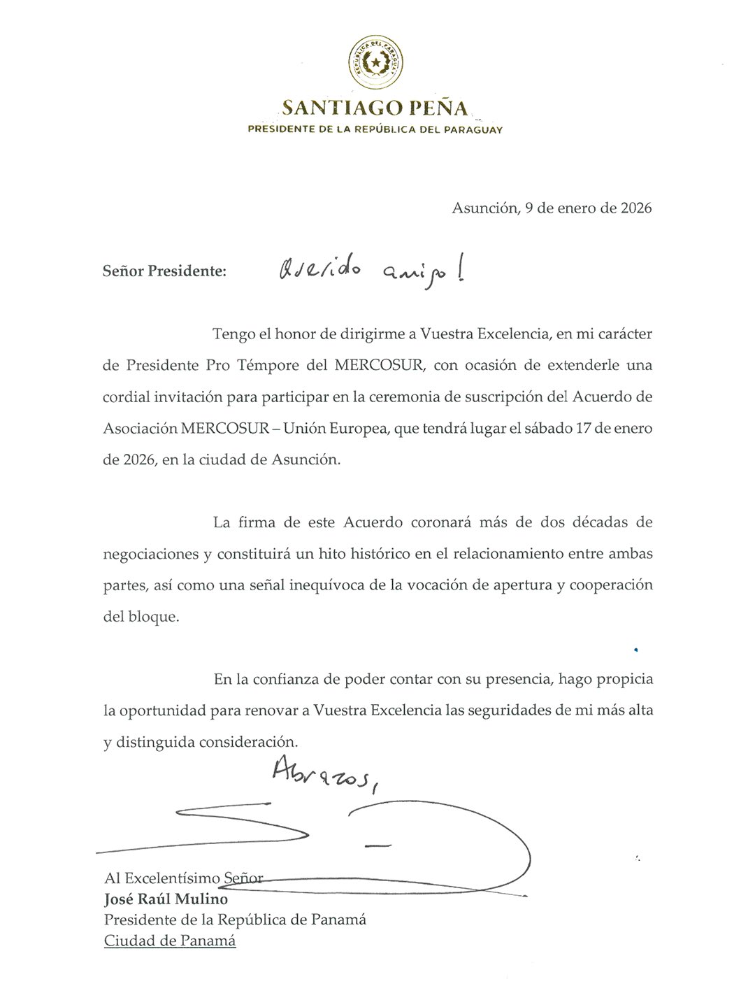 El presidente José Raúl Mulino, fue invitado por su homólogo de Paraguay, Santiago Peña, a participar en la ceremonia de firma del Acuerdo de Asociación entre el Mercosur y la Unión Europea, que se llevará a cabo este sábado en Asunción, Paraguay.