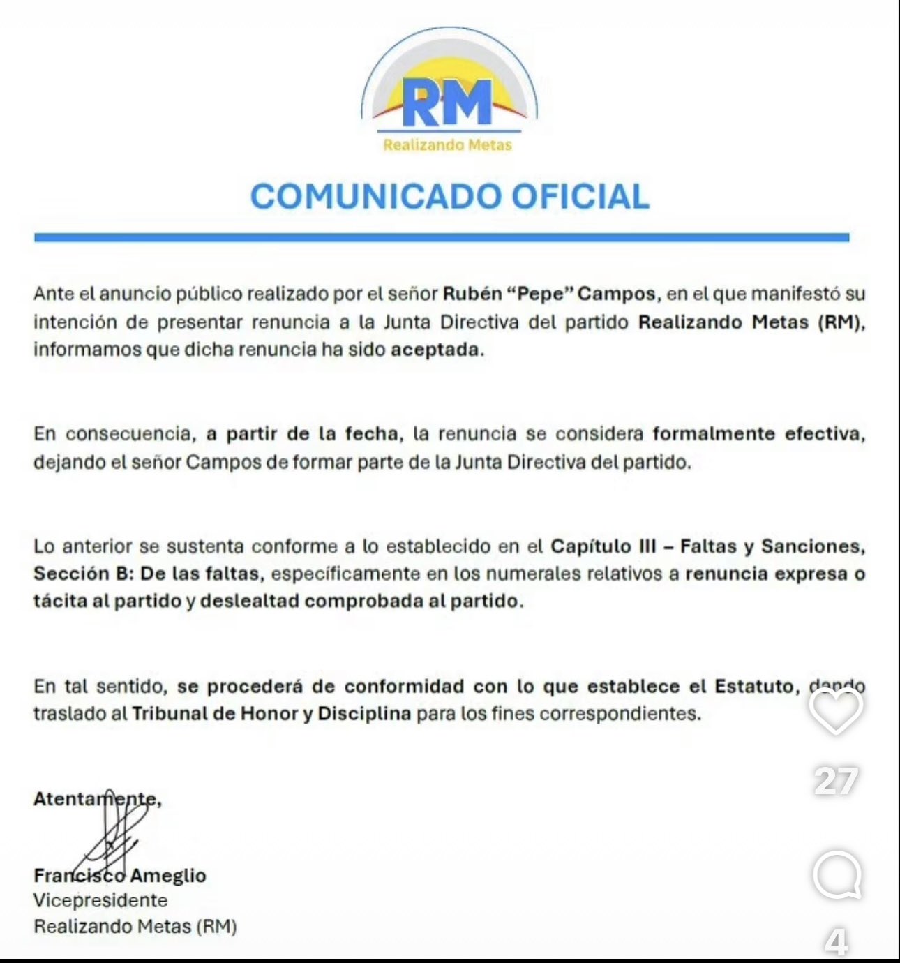 El partido Realizando Metas (RM) confirmó la aceptación de la renuncia de la directiva del diputado del PARLACEN, Rubén Pepe Campos, luego de que el propio dirigente hiciera pública su decisión de abandonar el colectivo.