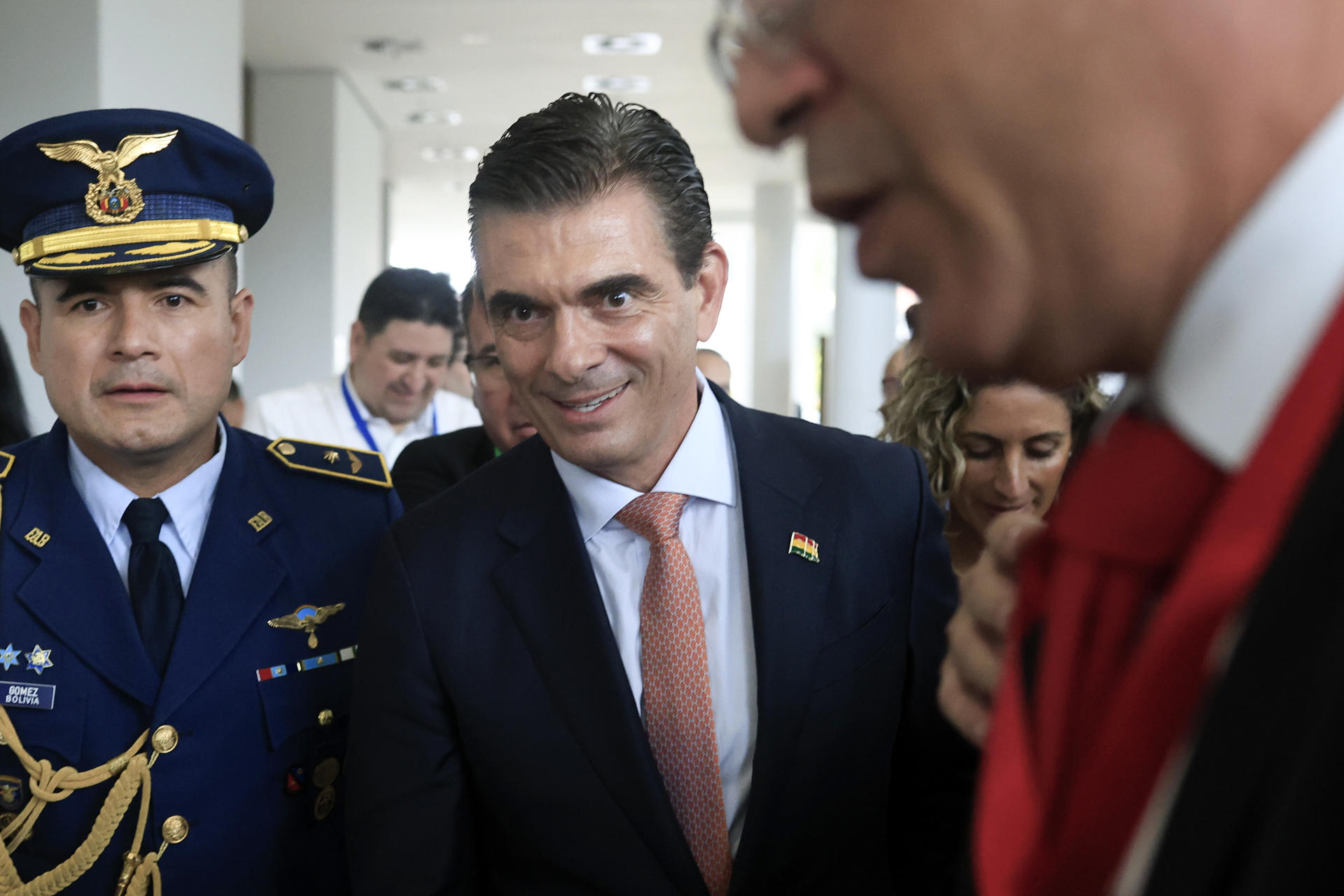 El presidente de Bolivia, Rodrigo Paz (c), sale del Foro Económico Internacional América Latina y el Caribe 2026. EFE/ Bienvenido Velasco