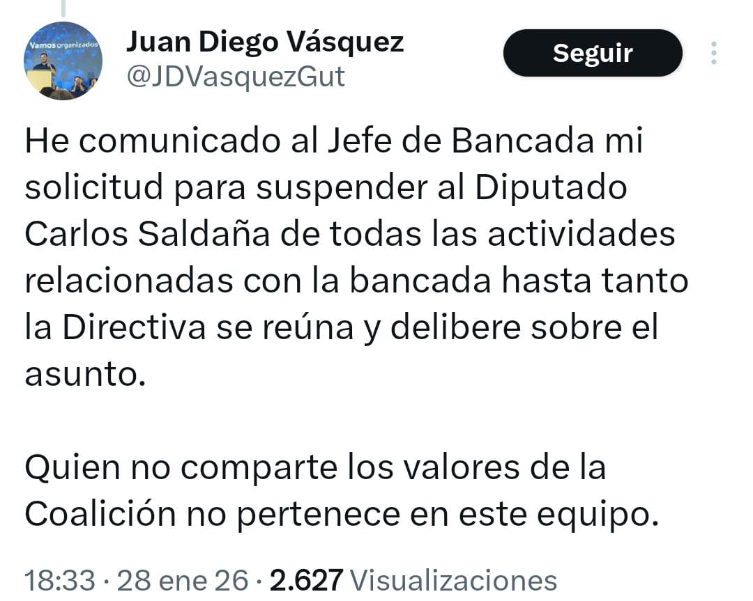Vásquez reiteró que los valores de la coalición y los de Saldaña, “evidentemente no son iguales”, por lo que lo instó a hacer política en equipos distintos.