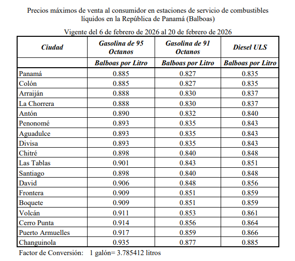 En las estaciones de servicio de Panamá y Colón, los precios por galón quedarán establecidos de la siguiente manera: