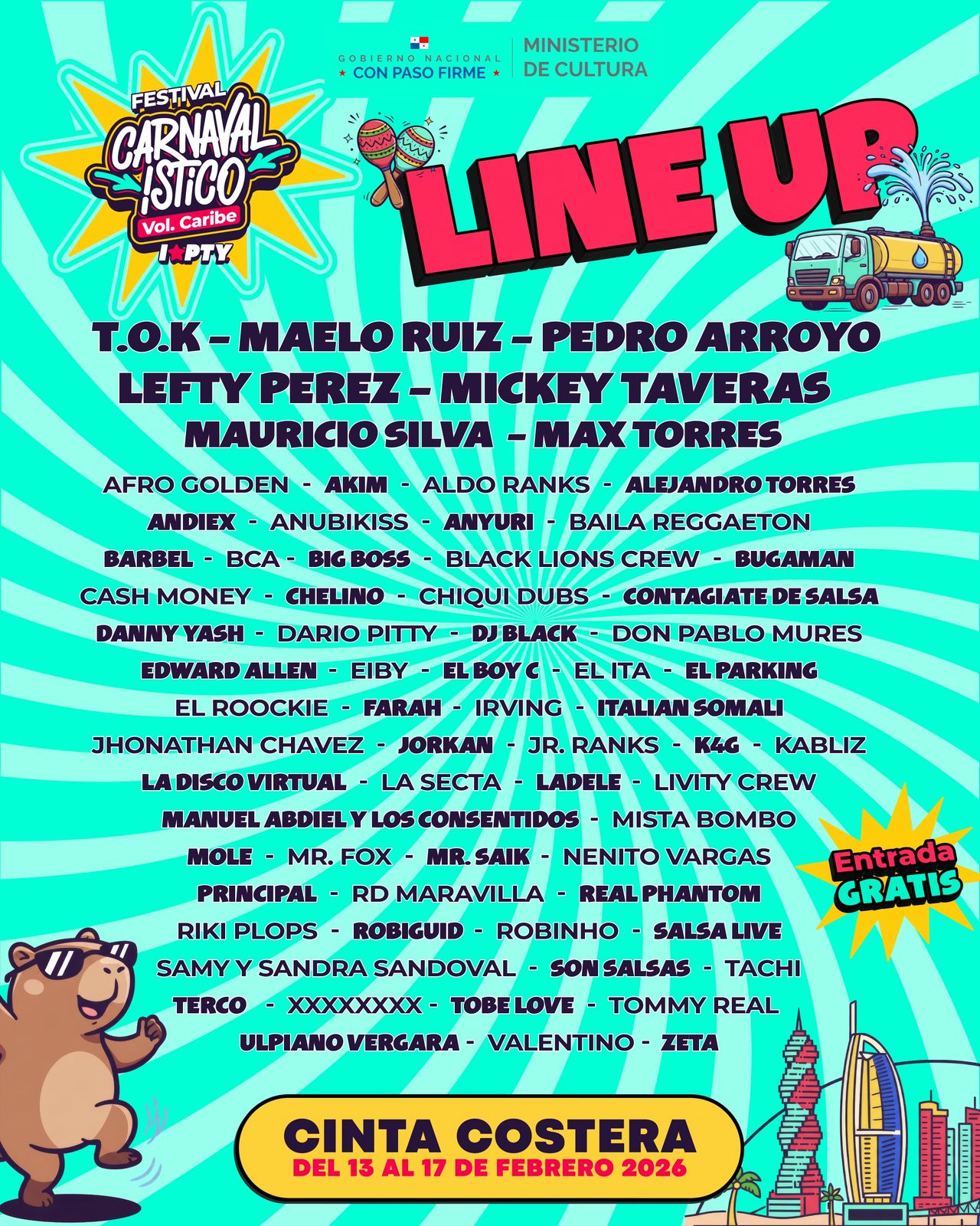 El Festival Carnavalístico Volumen Caribe 2026 presentó oficialmente su cartel de artistas nacionales e internacionales que animarán la farra en la capital, que se llevará a cabo en la Cinta Costera del 13 al 17 de febrero, con culecos y tarimas de espectáculos.