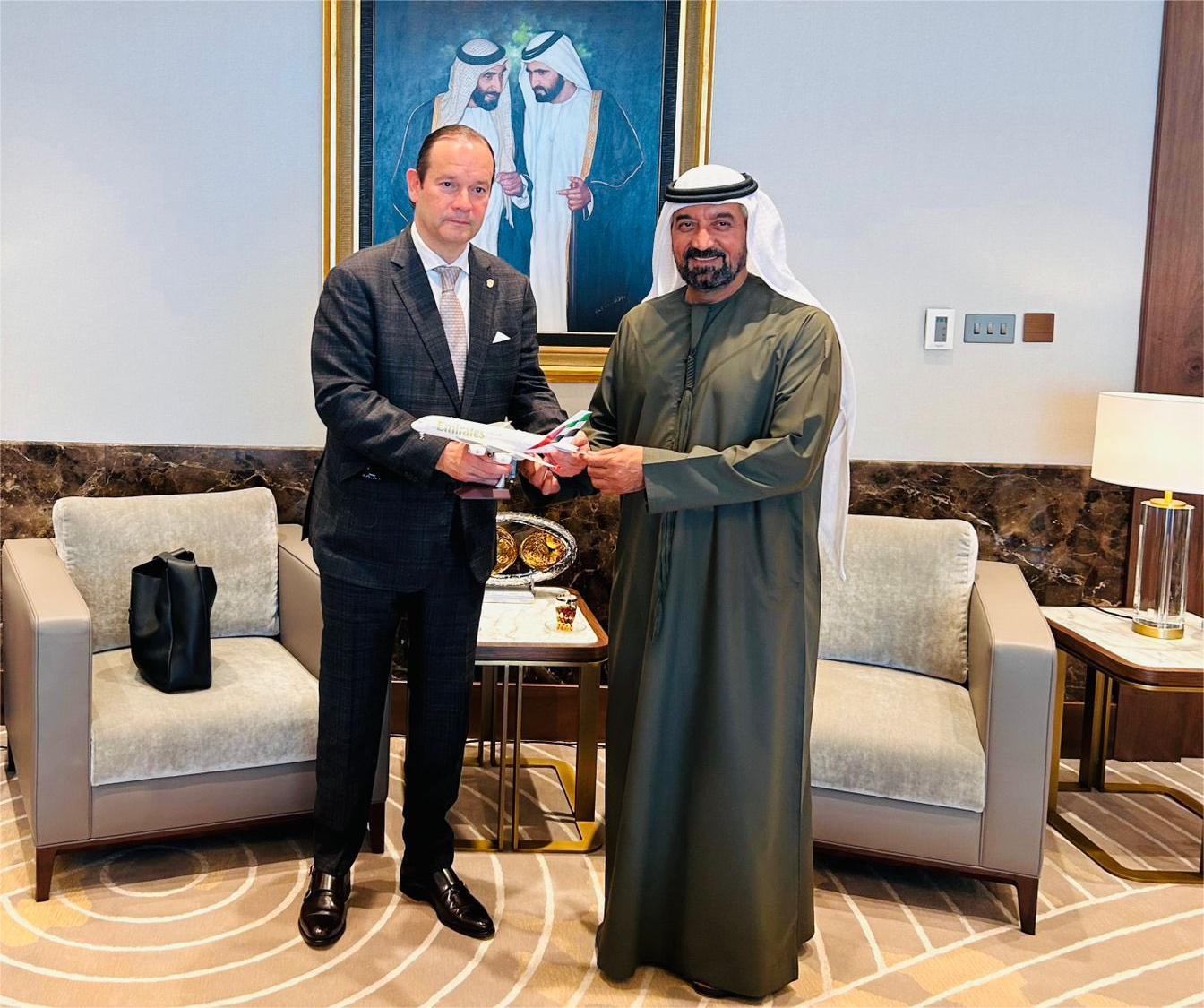 Como parte de su agenda en Emiratos Árabes Unidos, y al término de su visita oficial, el canciller Martínez-Acha se reunió con el sheikh Ahmed bin Saeed Al Maktoum, presidente y CEO de Emirates Airlines y del Grupo Emirates, en un encuentro que se desarrolló en un clima de cordialidad y cooperación.