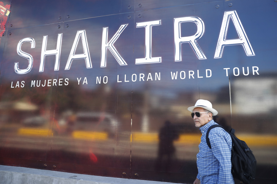 Un hombre camina frente a un aviso publicitario que anuncia el concierto de la cantante colombiana Shakira en San Salvador. EFE/Rodrigo Sura.