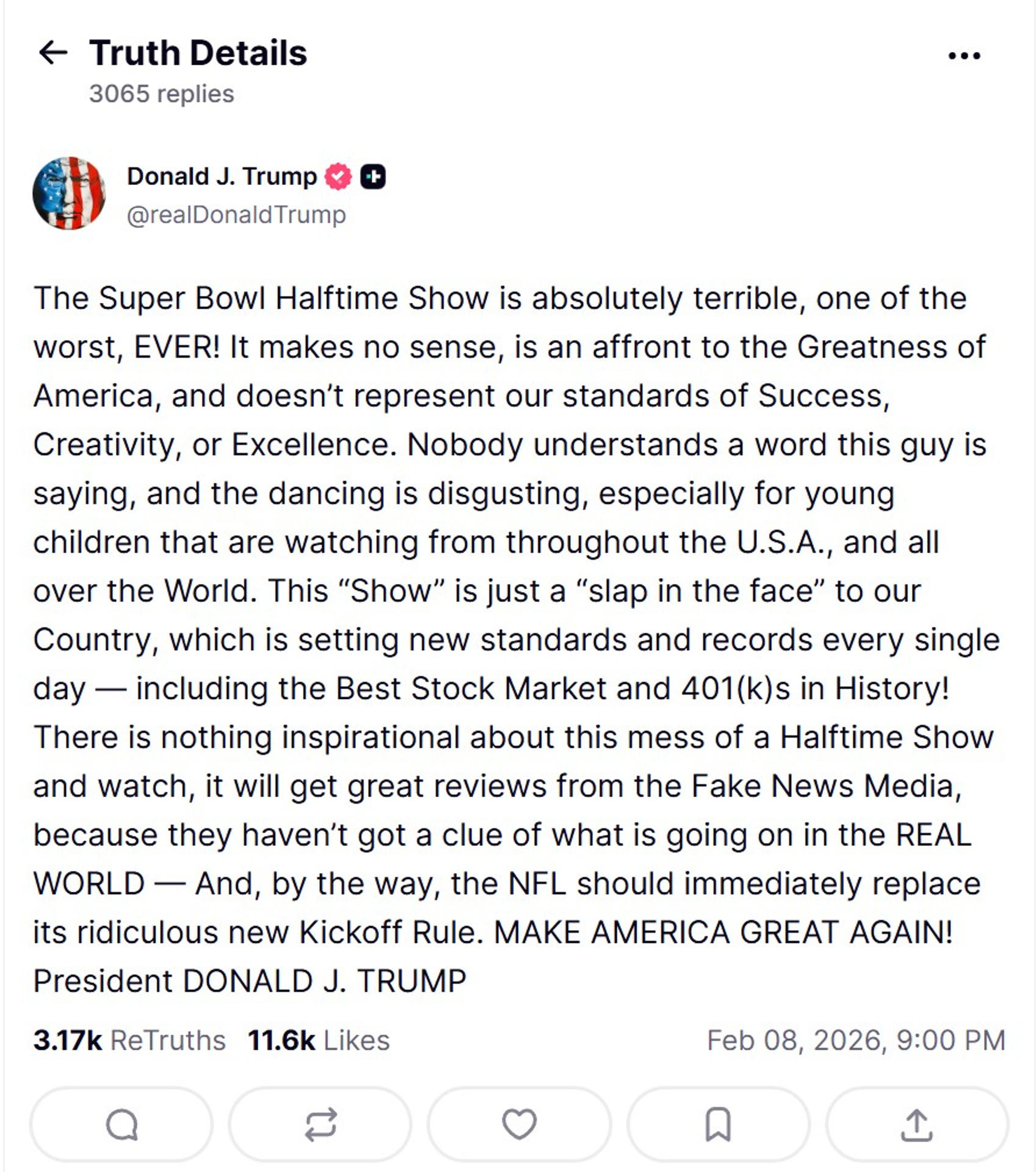 “¡El espectáculo del medio tiempo del Super Bowl es absolutamente terrible, uno de los peores de la historia!”, dijo el presidente en la red social Truth Social.