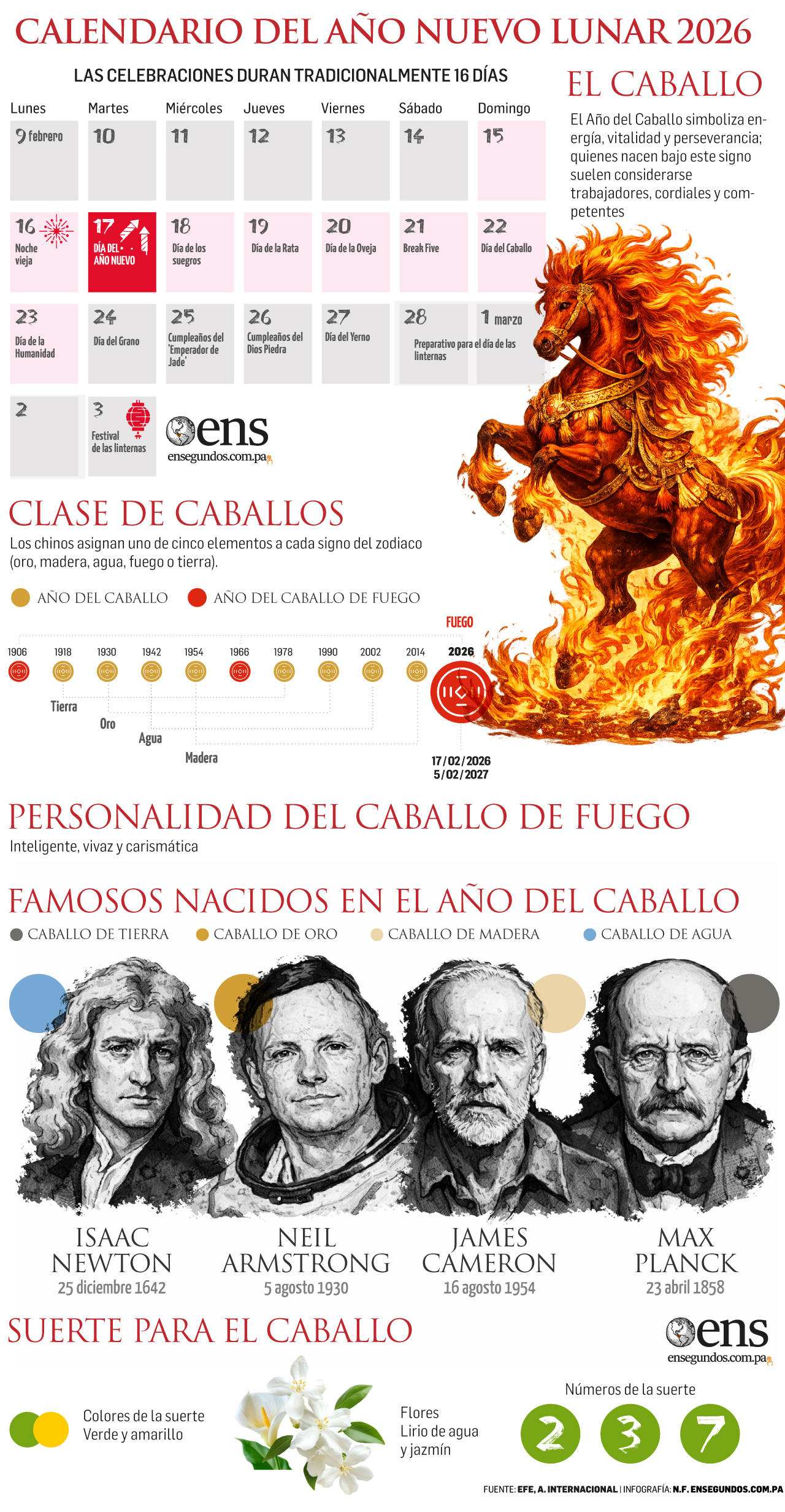 Cintillo, Infografía, Mundo Todo lo que hay que saber sobre el Año Nuevo Infografía N. Fernández, Ensegundos.com | EFE 16 febrero, 2026 Año Nuevo Lunar Arte Caballo de Fuego China Cultura espectáculos Infografia Ilustración: N. Fernández, Ensegundos.com.pa WhatsAppFacebookTwitterGoogle+LinkedInPinterest La principal festividad china, el Año Nuevo lunar celebra este 17 de enero la llegada del año del Caballo de Fuego, signo al que han pertenecido importantes líderes mundiales como Isaac Newton, Neil Armstrong, Max Planck y James Cameron.