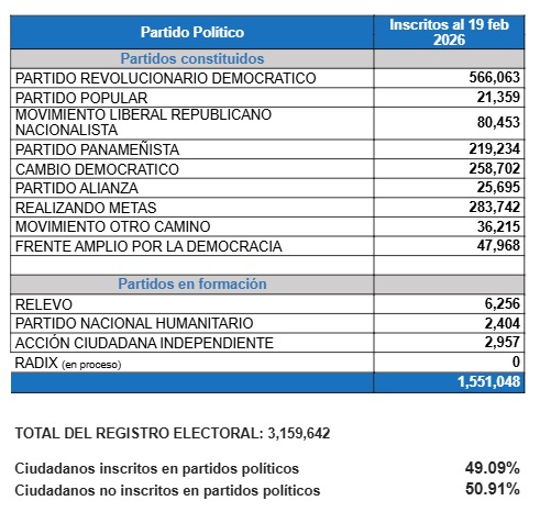 En cuanto a los partidos en formación, Relevo reporta 6,256 inscritos; Acción Ciudadana Independiente, 2,957; y el Partido Nacional Humanitario, 2,404, mientras que Radix se mantiene aún en proceso de conformación.