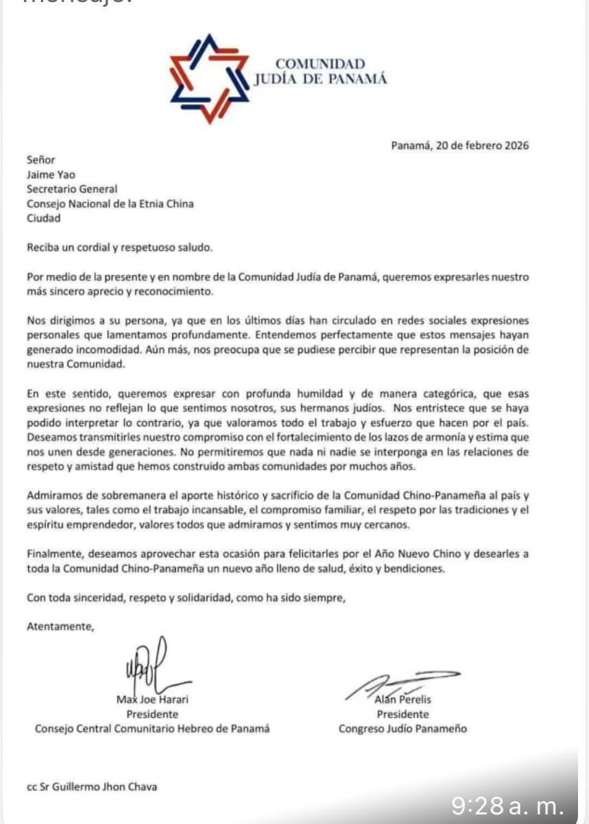 La Comunidad Judía de Panamá expresó públicamente su respeto y reconocimiento hacia la comunidad chino-panameña y tomó distancia de comentarios que han circulado recientemente en redes sociales, realizados por personas vinculadas a su colectividad, los cuales han sido interpretados como ofensivos.