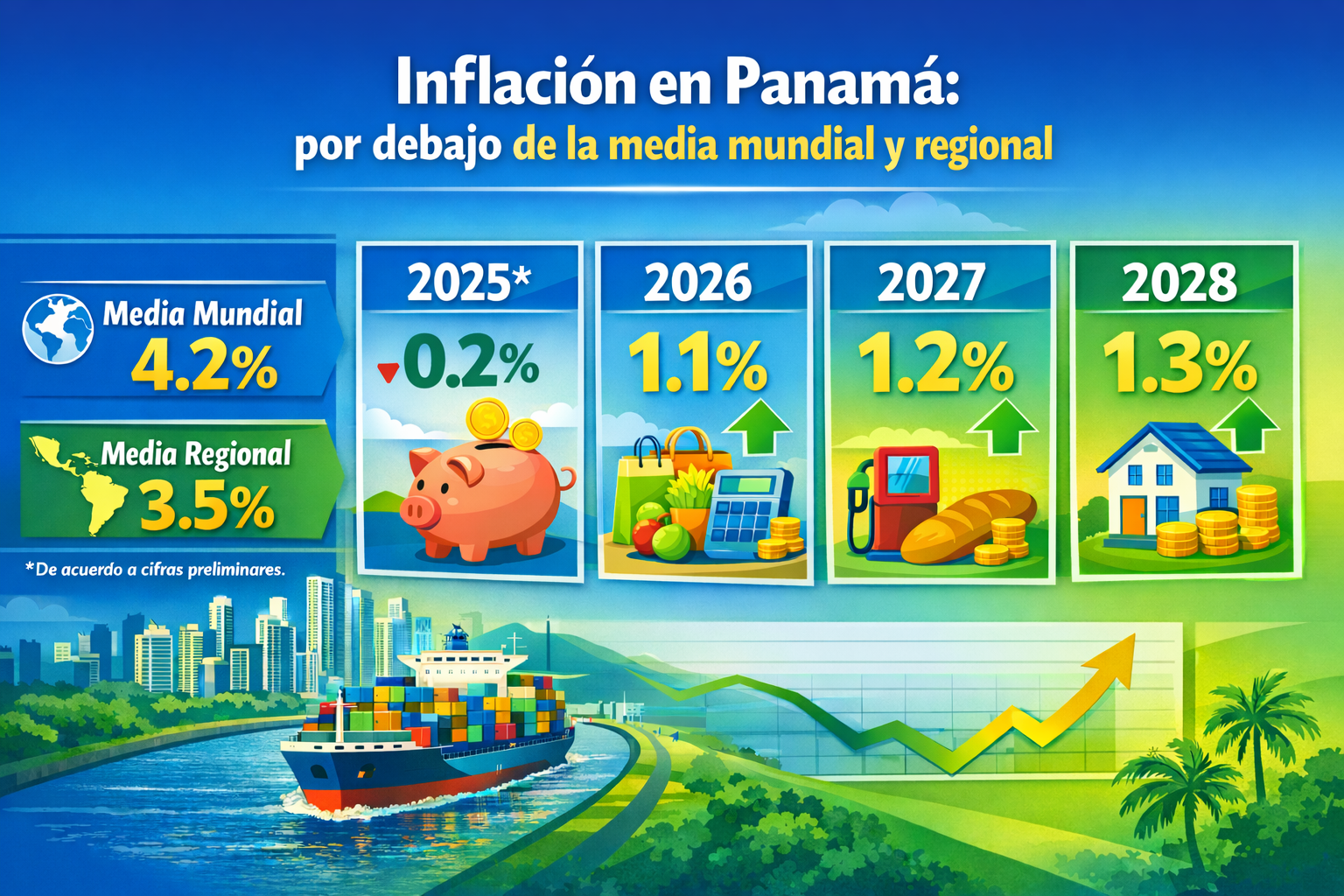 De cara al 2026, los principales motores de crecimiento serían la posible reactivación de la mina de cobre, la concesión de los puertos de Balboa y Cristóbal, el desarrollo de nuevas terminales portuarias y la continuidad de proyectos vinculados al Canal, agregó que las proyecciones indican que la inflación se mantendría por debajo del 2%, el desempleo caería por debajo del 7% y el PIB crecería por encima del 5%.
