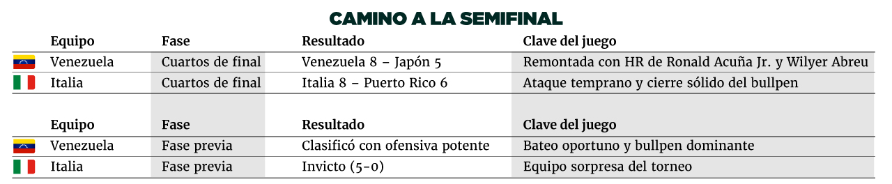 Aquí desarrollamos un análisis completo del juego de semifinal del Clásico Mundial de Béisbol 2026 entre la selección de Italia y Venezuela, que se disputa hoy en Miami a la 7:00 p.m. hora de Panamá y define al rival de Estados Unidos en la final. El ganador jugará la final contra Estados Unidos, que ya aseguró su lugar tras vencer a República Dominicana.