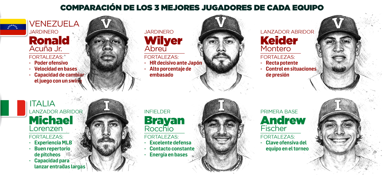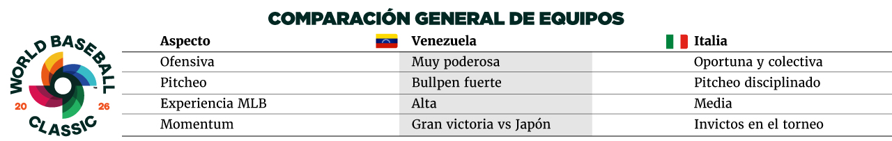 Mayor profundidad ofensiva de Venezuela. Italia depende más del pitcheo y del juego táctico.
