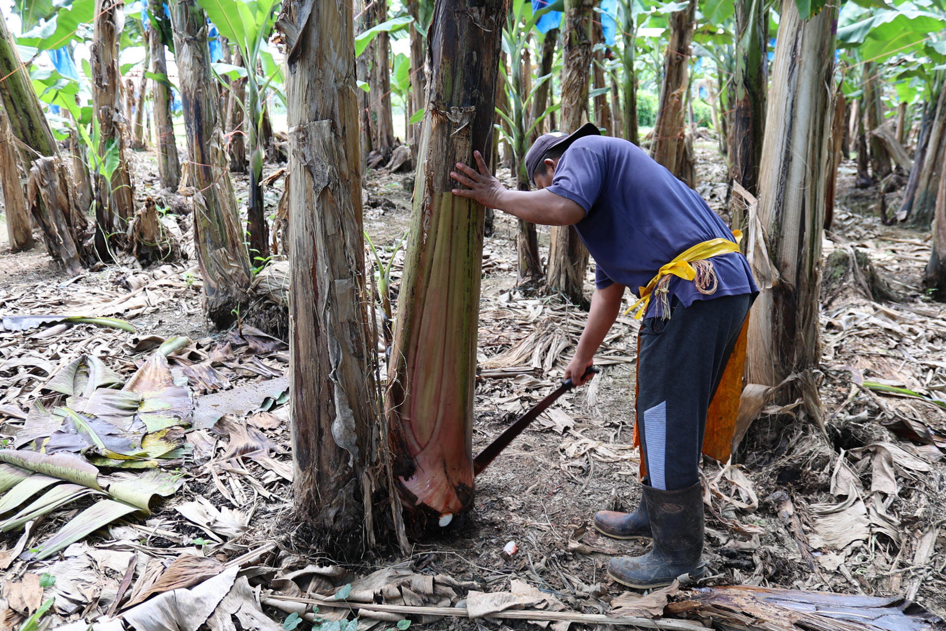 José Artola, a quien sus conocidos llaman ‘Loncho’, mientras trabaja en la finca 15 en unas plantas de banano que fueron abandonadas el año pasado, en medio de una crisis sindical que acabó con esta industria, la principal fuente de empleos en la provincia de Bocas del Toro, occidente de Panamá.