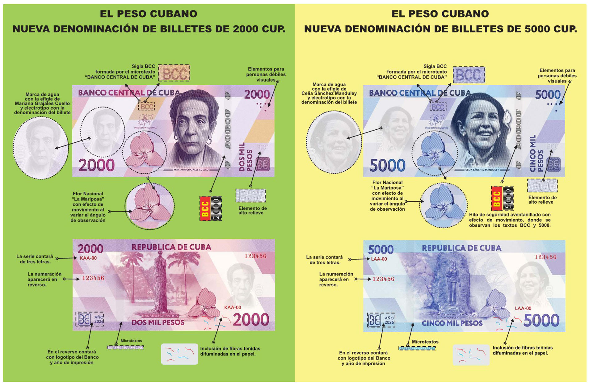 Estas nuevas denominaciones se incluyen por primera vez en la moneda cubana imágenes de figuras femeninas: las patriotas Mariana Grajales, madre de Antonio Maceo, uno de los líderes de las guerras de independencia del siglo XIX, y Celia Sánchez, una de las guerrilleras de la Sierra Maestra que al triunfo de la revolución en 1959 ocupó importantes cargos en el Gobierno.