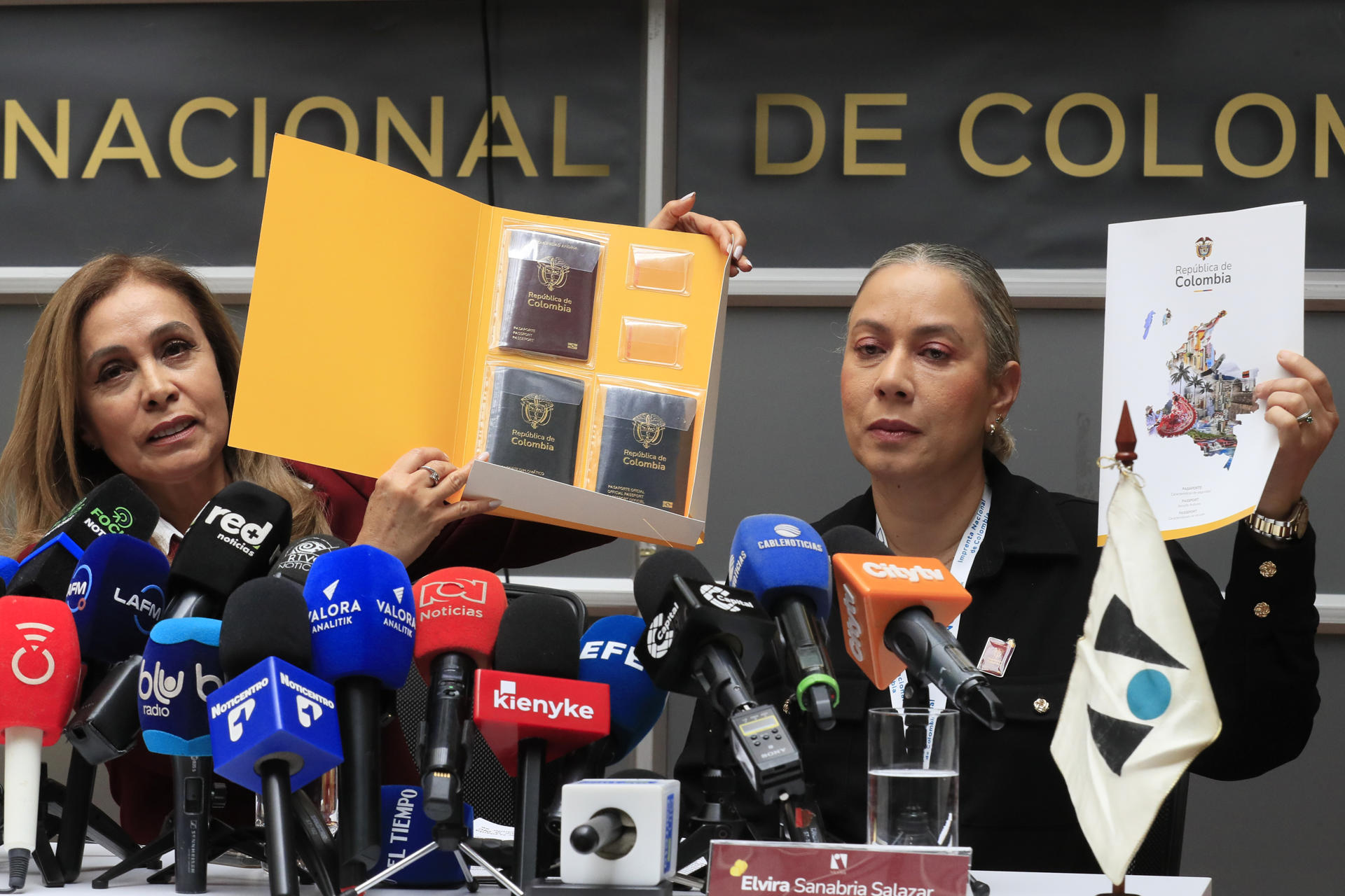 La gerente general de la Imprenta Nacional de Colombia, Viviana León (i), y la secretaria general de la Cancillería de Colombia, Elvira Sanabria, presentan el nuevo pasaporte del país durante una rueda de prensa este miércoles, en Bogotá (Colombia). EFE/ Carlos Ortega
