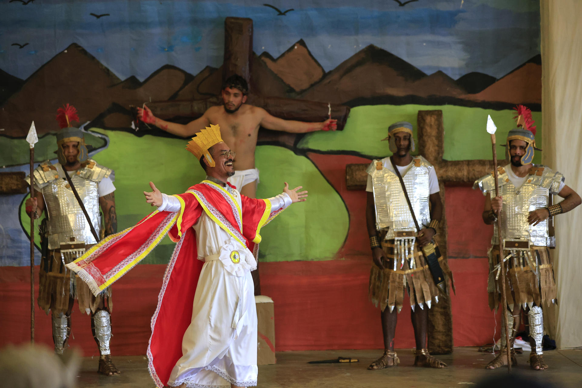 “Llevamos aproximadamente 30 días de preparación, mucho trabajo, esfuerzo, sacrificio, pero aquí estamos interpretando el personaje de Jesús”, dice Eduardo, identificado solo con el nombre, al concluir la obra, mientras porta aún la corona de espinos y el ropaje blanco salpicado de sangre.