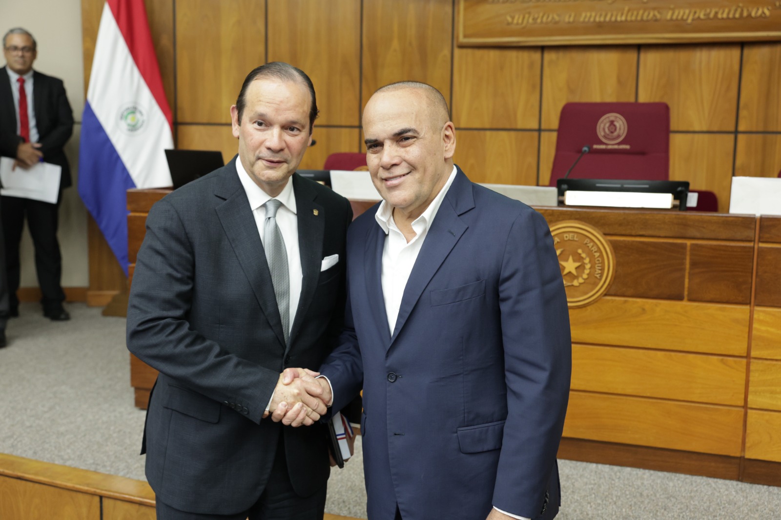 El marco de su visita oficial a Asunción, el ministro de Relaciones Exteriores, Javier Martínez Acha, fue recibido este miércoles por el presidente del Congreso Nacional, el senador Basilio Núñez, y expuso ante el pleno del Senado de este país sudamericano su visión del Paraguay, corazón de Sudamérica, y de Panamá, como puente del mundo.