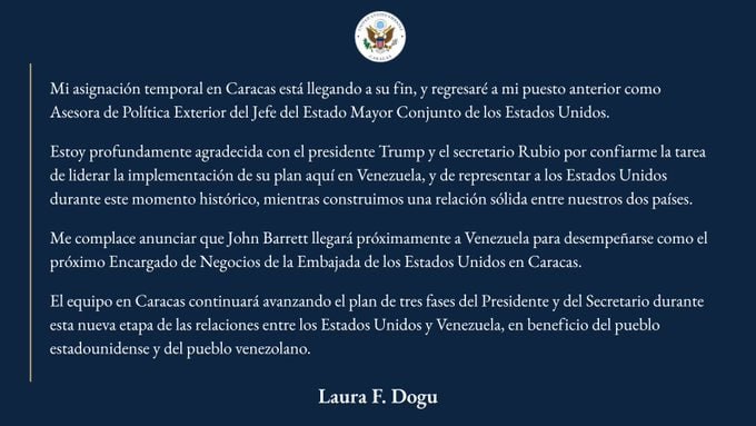 Dogu aclaró, en un comunicado compartido en las redes sociales de la Embajada de Estados Unidos en Venezuela, que su asignación fue de carácter temporal, enfocada en la reapertura de la Embajada de Estados Unidos en Caracas y el inicio de la estrategia de transición tras el restablecimiento de relaciones.
