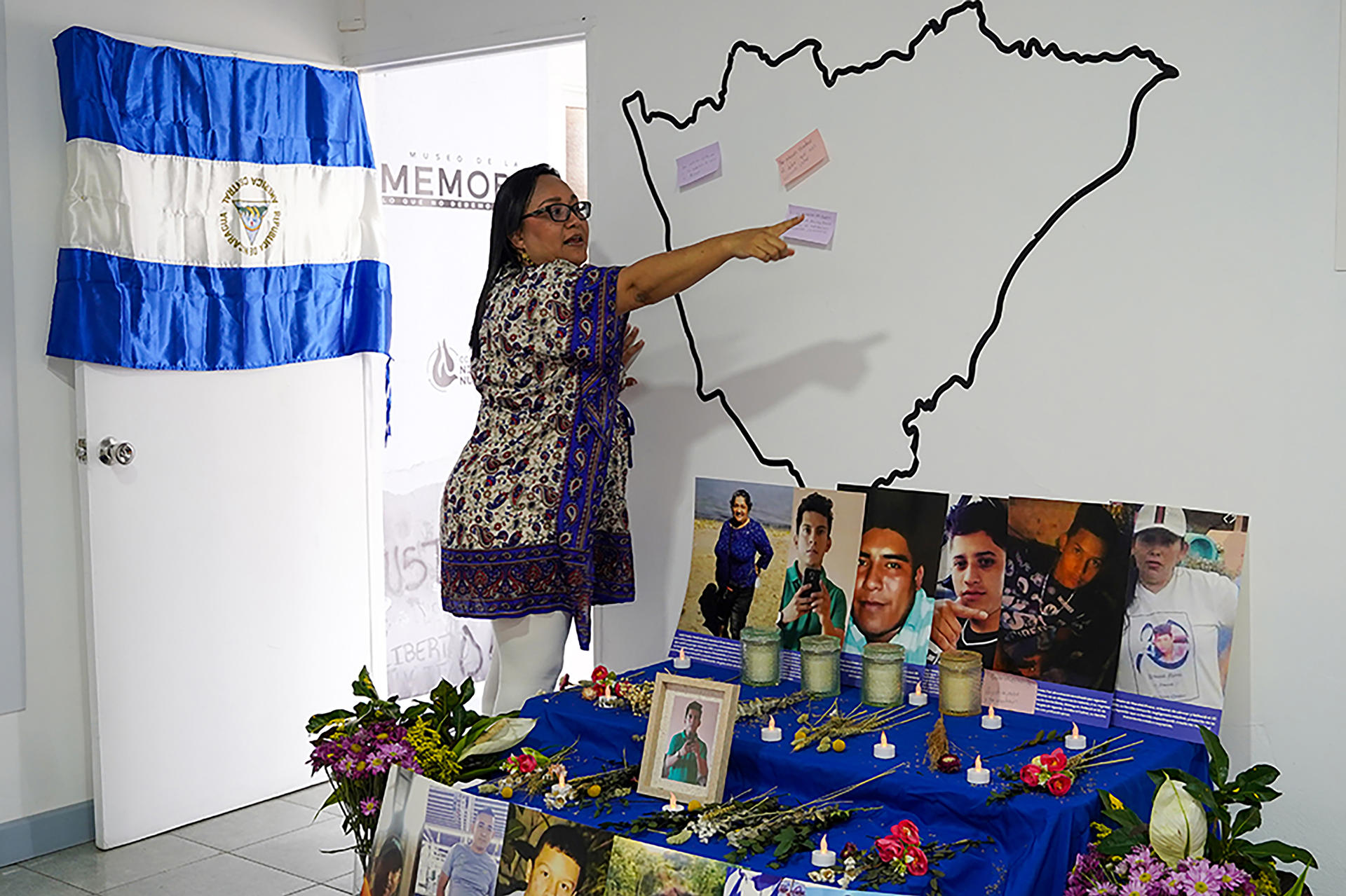 La nicaragüense Wendy Quintero, defensora de derechos humanos, muestra un altar conmemorativo este lunes, en el Museo de la Memoria en San José (Costa Rica).  EFE/STR